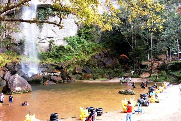 Di sebuah lokasi, sebuah air terjun yang cukup indah berada tepat di tepi jalan. Butir-butir air yang jatuh dari tebing batu terbilang cukup halus jika dibanding dengan beberapa air terjun yang pernah saya lihat. Dan di bawah air terjun tersebut, ada sebuah kolam renang berukuran sedang.